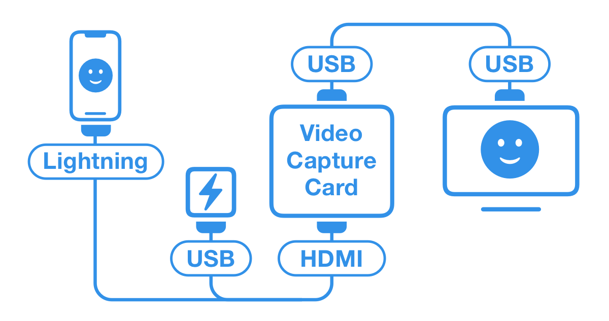 - Falls Sie den Lightning Digital AV Adapter von Apple nutzen, ist ein zusätzliches standard HDMI-Kabel notwendig (beide Enden mit HDMI-Stecker), das den Adapter mit der Video Capture Card verbindet.