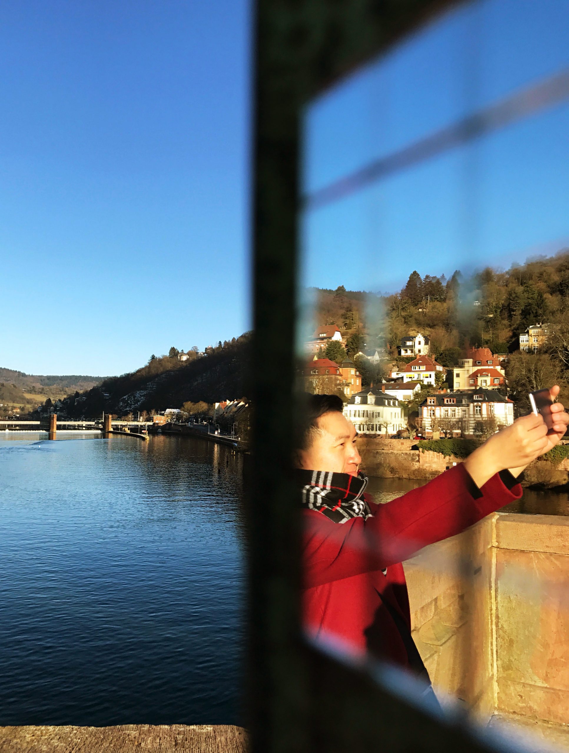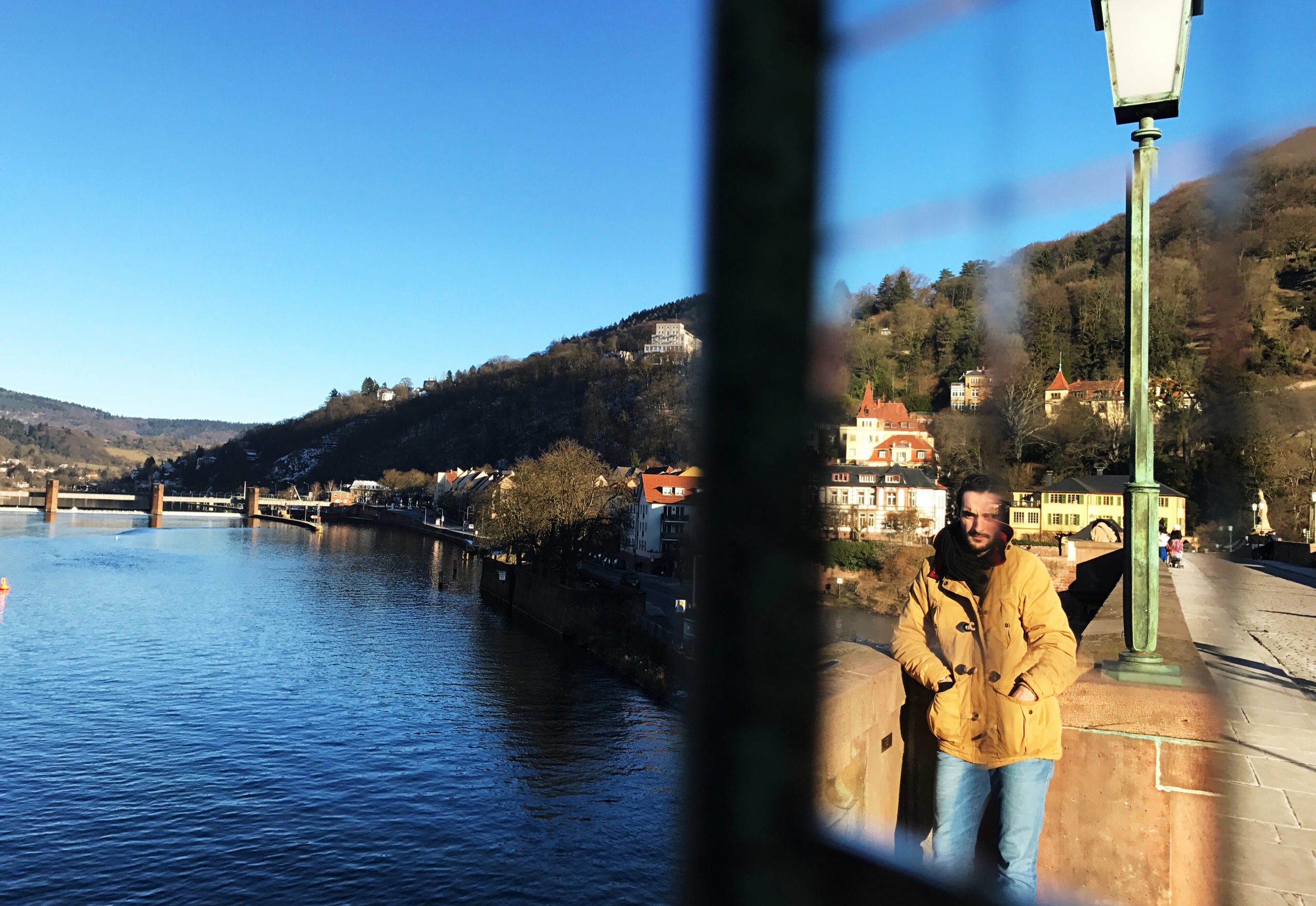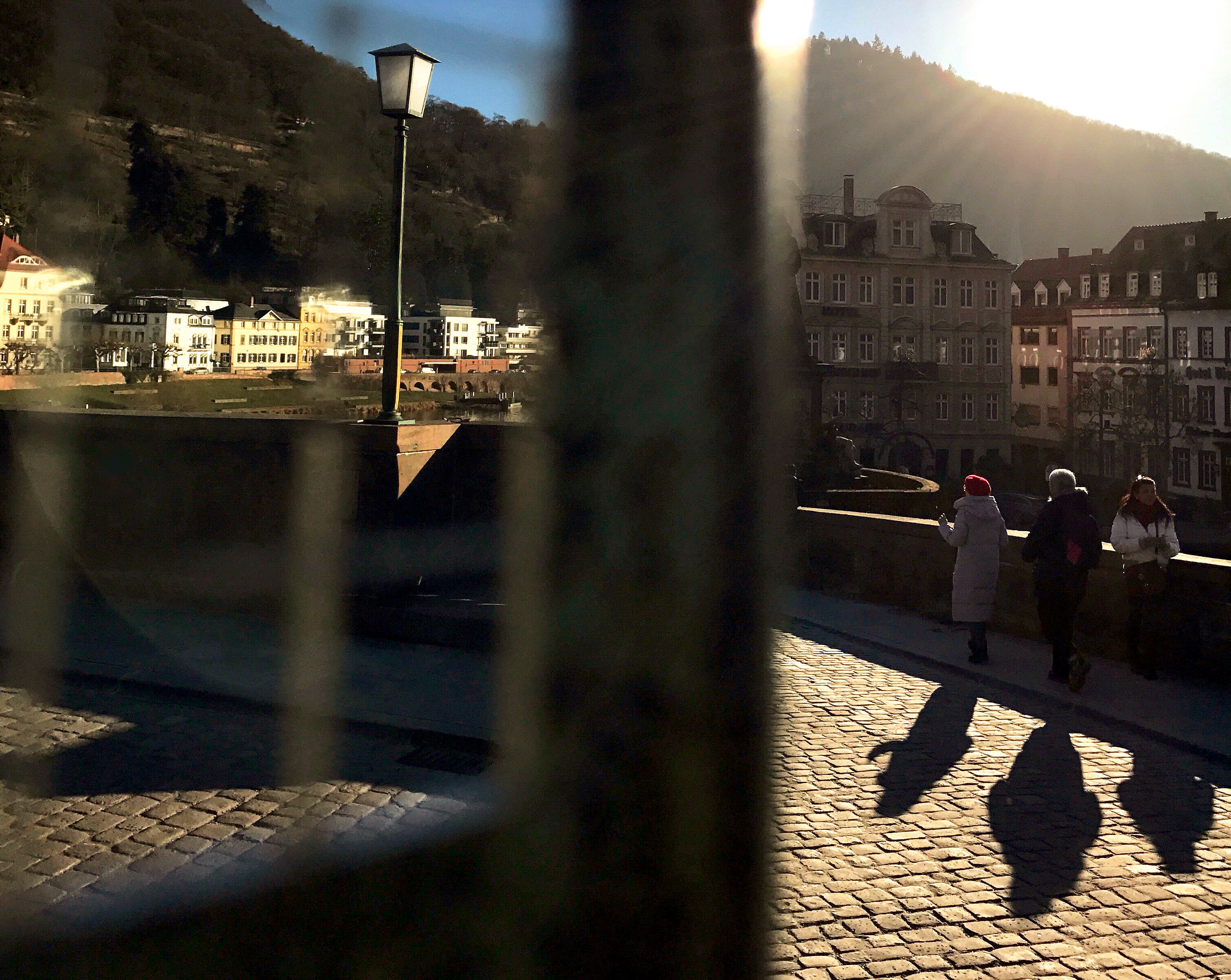 Die Alte Brücke ist eines der beliebtesten Touristenziele der Stadt, von wo aus täglich hunderte Besucher die wunderschöne Aussicht auf das Schloss und den Neckar genießen. Allein an diesem Nachmittag kurz vor Sonnenuntergang standen mindestens ein Dutzend Besucher entlang des Brückengeländers. Manche in Gruppen, manche alleine, und die meisten davon machten Selfies mit ausgestreckten Armen. Andere hatten sich mit ihren großen DSLR-Kameras und schweren Stativen in Stellung gebracht und bemühten sich sichtlich um den bestmöglichen Bildaufbau zwischen Fluss, Stadt und den sanften Hügeln im Hintergrund.