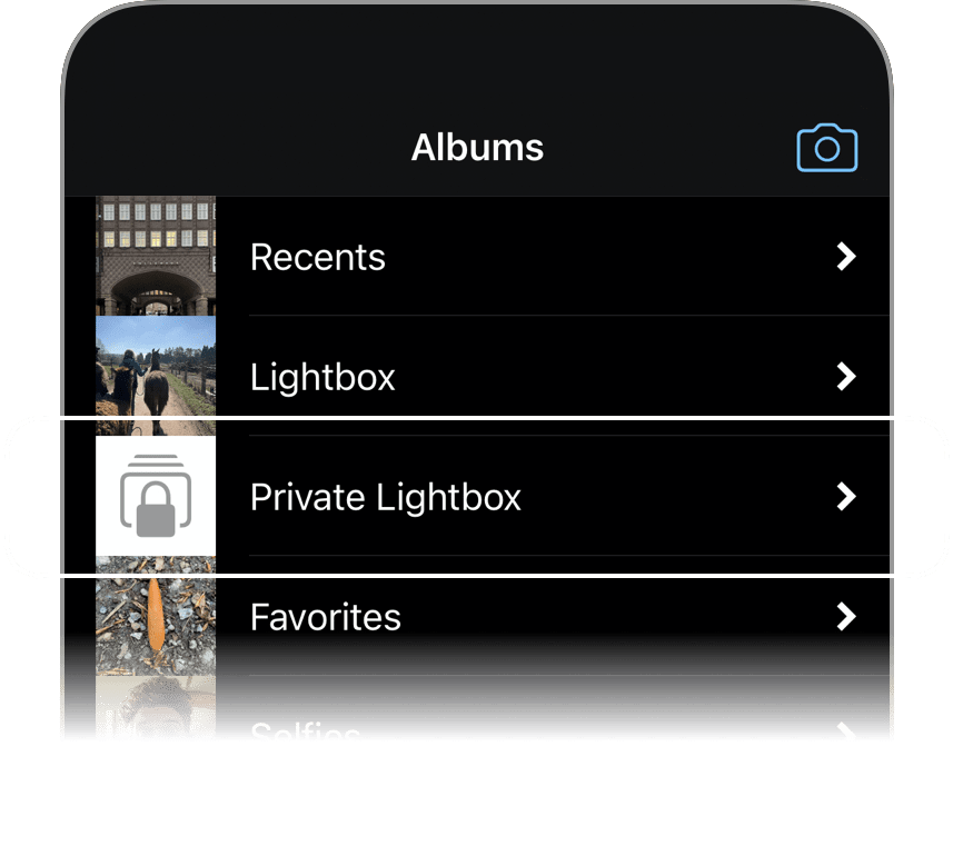 Use the Private Lightbox to keep your photos and videos extra secure from prying eyes. Easily access your photos and videos in this protected folder with FaceID or TouchID authentication. The Private Lightbox is specially designed for personal files.