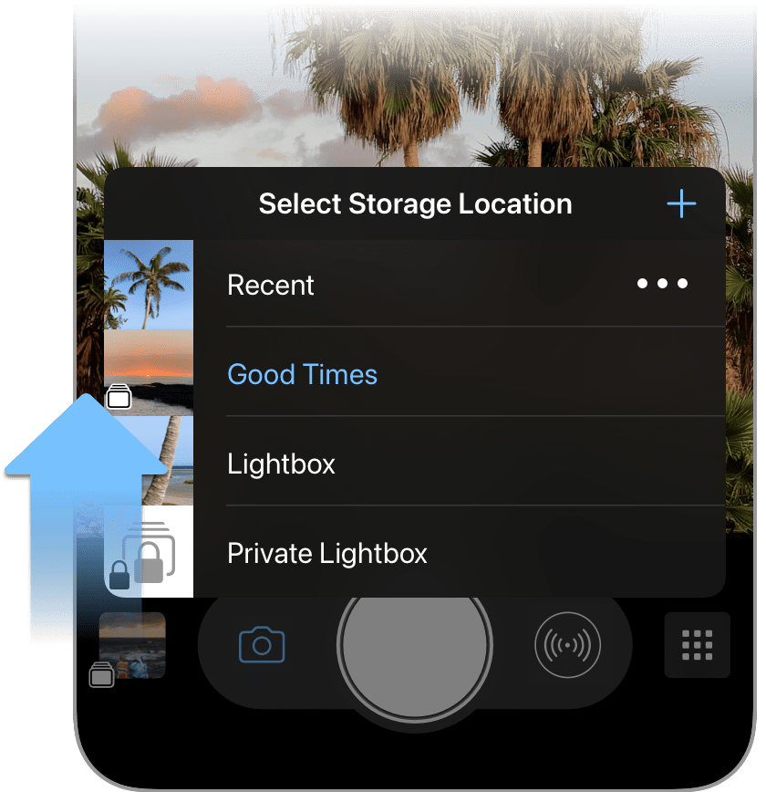 Organize your captures with our handy Album Selector. Swipe up from the preview thumbnail on the Capture Screen to select where you want to save new photos and videos: Camera Roll, custom iOS Album, Lightbox, or Private Lightbox.