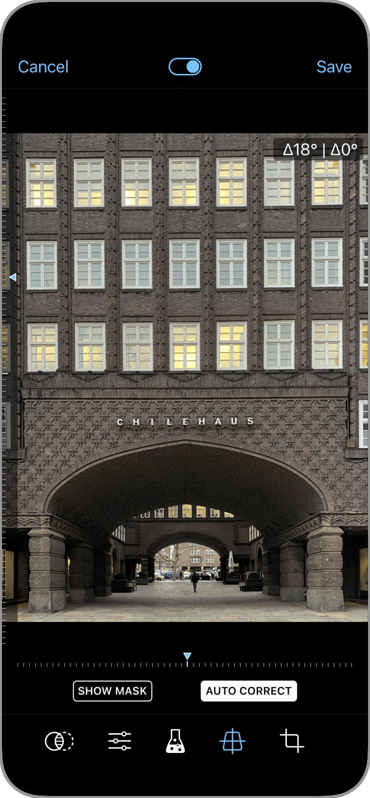 Correcting perspective distortion gives a more professional appearance to your photos. Swipe on the photo to manually adjust the perspective or tap Auto Correct for an immediate adjustment.