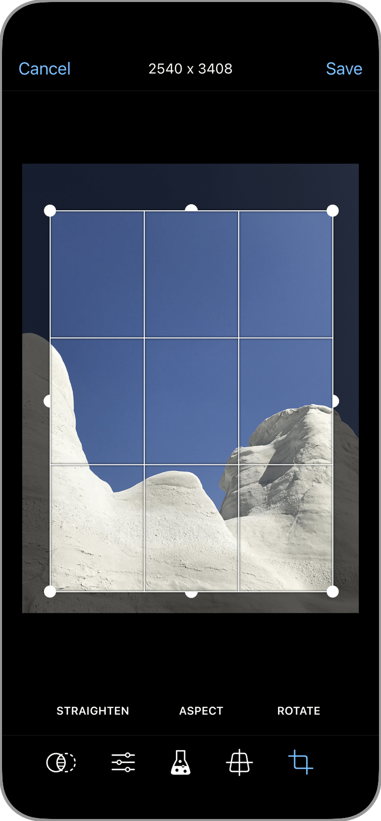 Fix crooked shots by cropping or rotating. Choose an aspect ratio preset for precise crops.