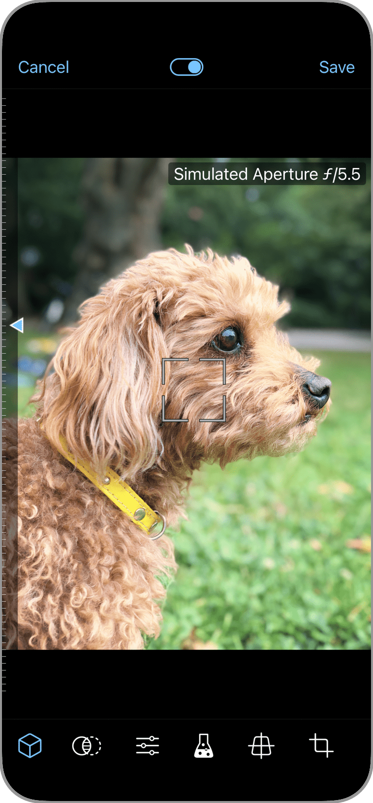 Tap to set focus and swipe up/down to control the amount of background blur (bokeh) via simulated aperture.
