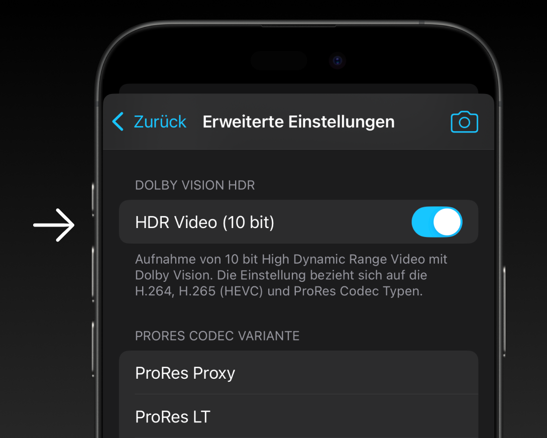Stellen Sie sicher, dass „HDR-Video“ in ProCamera aktiviert ist, bevor Sie mit dem Filmen beginnen. Die Funktion ist in der Regel standardmäßig eingeschaltet, aber es lohnt sich, dies noch einmal zu überprüfen.