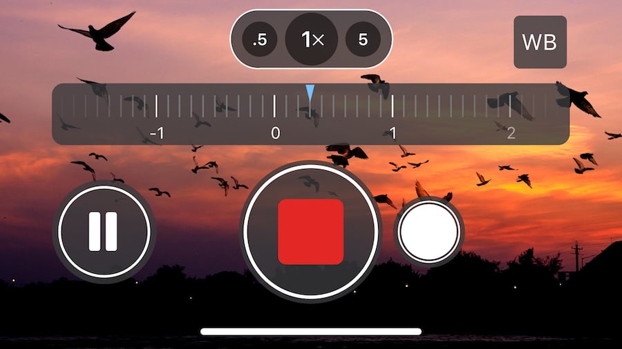 Sobald Sie mit dem Filmen begonnen haben, erscheint eine neue „Pause“-Taste (neben der Aufnahme-Taste). Nach dem Pausieren können Sie entweder die Aufnahme durch Antippen des runden Aufnahmeknopfes fortsetzen – oder die Aufnahme durch Antippen des quadratischen Stop-Buttons beenden und speichern.