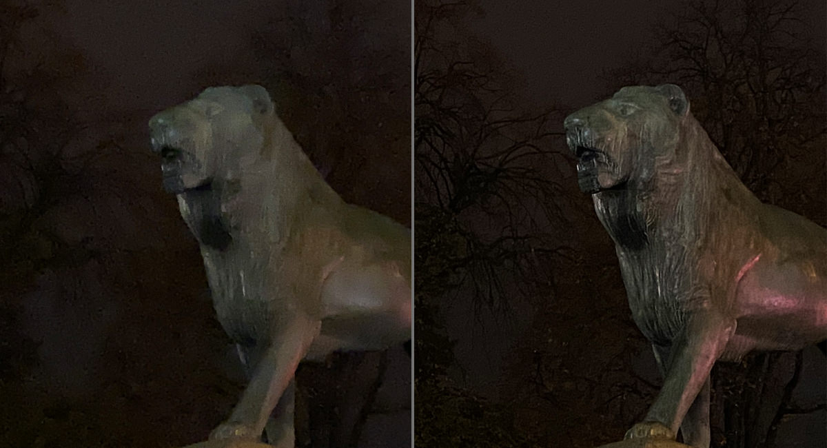 - c) Low light: Standard (not deep) fusion, previously called AIS, kicks in for better results in dim scenes. The continuous shooting rate slows down (around 2 photos per second) because additional processing takes place.