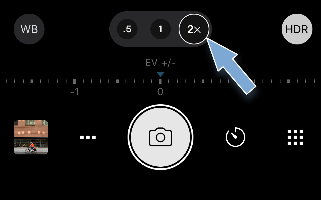 In ProCamera v13.1, we combined digital zooming and selecting lenses into one handy control right on the capture screen. The displayed zoom factors can be quickly selected by tapping the round buttons. In single lens as well as fusion camera mode, you can also swipe over the zoom factor (left/right) to dial in a custom zoom. In fusion mode, the multiple lenses can work hand in hand to achieve better image quality than traditional digital zoom. Choose one of the base zoom factors (0.5x, 1x, 2x) for optimal results.