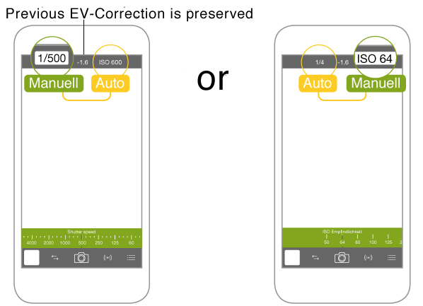 In general, the full manual mode (or the semi-automatic SI mode = Shutter/ISO Priority) is activated in the Control Panel. Tap the icon with the three lines bottom right and tap the “M” icon (green = Manual Mode is active). Here, you can also activate the semi-automatic “SI” mode.