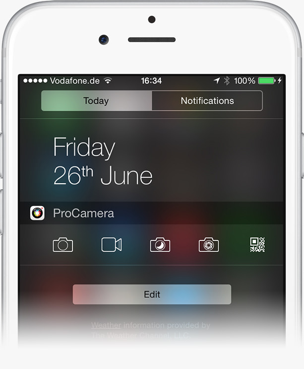 The today view can be customized via the Edit-button at the bottom (only visible when your iPhone is unlocked). After you have updated to ProCamera v6.3, the app will be listed in the Edit-menu. By tapping the little green + icon in front of the app name, you add the associated widget to your Today Screen.