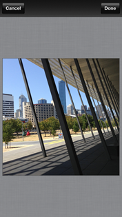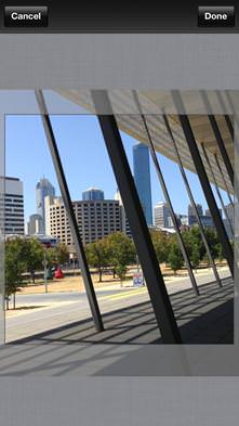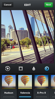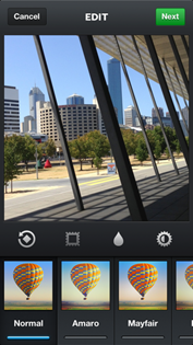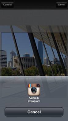 | Press Done (top-right) to commit the changes and then click on the Open in Instagram icon that pops up. | This loads your photograph straight into the Instagram Edit screen. | From here you can still apply all the Instagram filters and tilt-shift effects. |