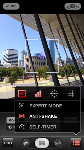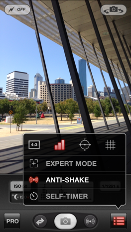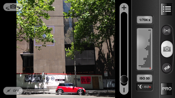 ProCamera 4.0 also gives you an optimised digital zoom (you can’t zoom at all in Instagram). The standard zoom function can be found at the left of the image and can be activated with an up/down swipe (landscape orientation). Otherwise you can activate the pinch to zoom in the Settings Menu. To do this click on PRO>SETTINGS>MORE>Pinch to Zoom> ON.