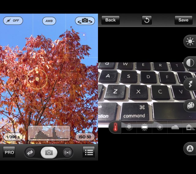 ProCamera’s main purpose is to give you more manual control of your camera, and to that end, it delivers… oh boy, does it deliver. It brings a much more powerful interface to the integrated camera in “Expert” mode, allowing you exceptional control over focus, exposure, white balance, and lighting.