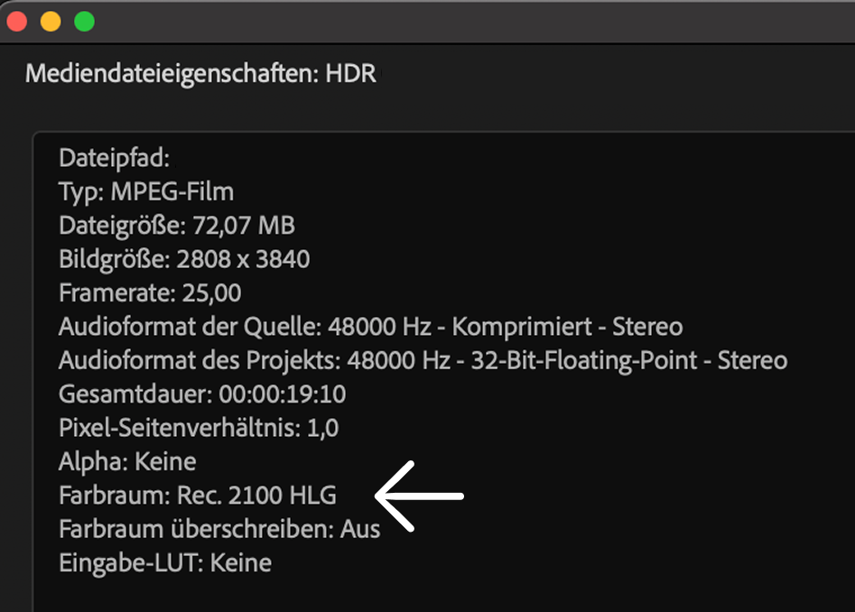 - Farbprofil überprüfen: Es sollte Rec. 2100 HLG sein. Wenn stattdessen Rec. 709 angezeigt wird, handelt es sich nicht um echtes HDR-Material