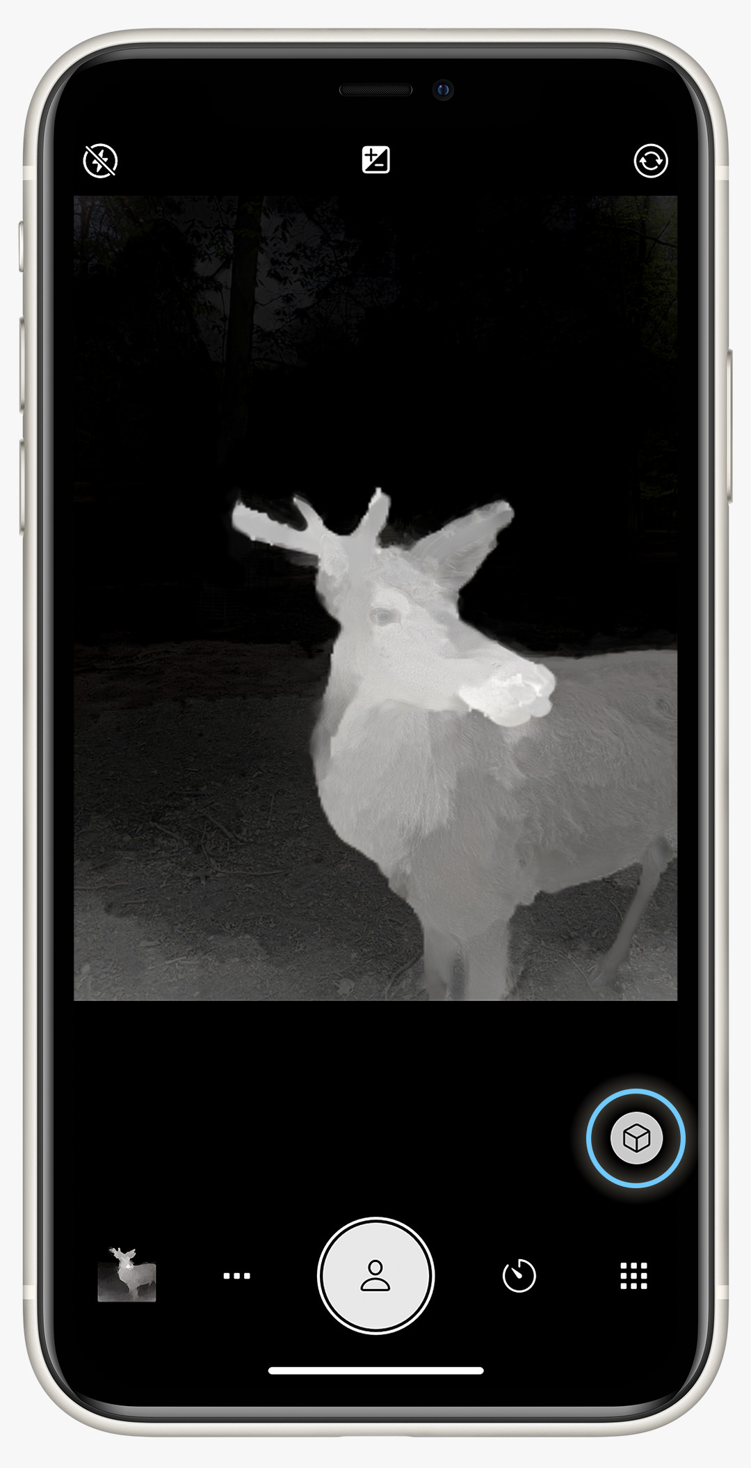 View the depth information of your current scene in real time: To activate the new depth preview mode, tap the box symbol button in Portrait Mode (see screenshot). By enabling the depth preview, you can check how the camera “sees” the three-dimensional world around you before taking a photo. The brighter an area is highlighted in the preview the closer it appears to the camera. Please note that the final depth map of the photo will be more detailed than the live preview.