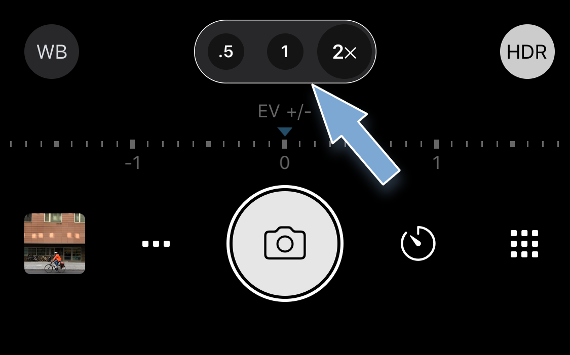 In ProCamera v13.1, we combined digital zooming and selecting lenses into one handy control right on the capture screen. The displayed zoom factors can be quickly selected by tapping the round buttons. In single lens as well as fusion camera mode, you can also swipe over the zoom factor (left/right) to dial in a custom zoom. In fusion mode, the multiple lenses can work hand in hand to achieve better image quality than traditional digital zoom. Choose one of the base zoom factors (0.5x, 1x, 2x) for optimal results.