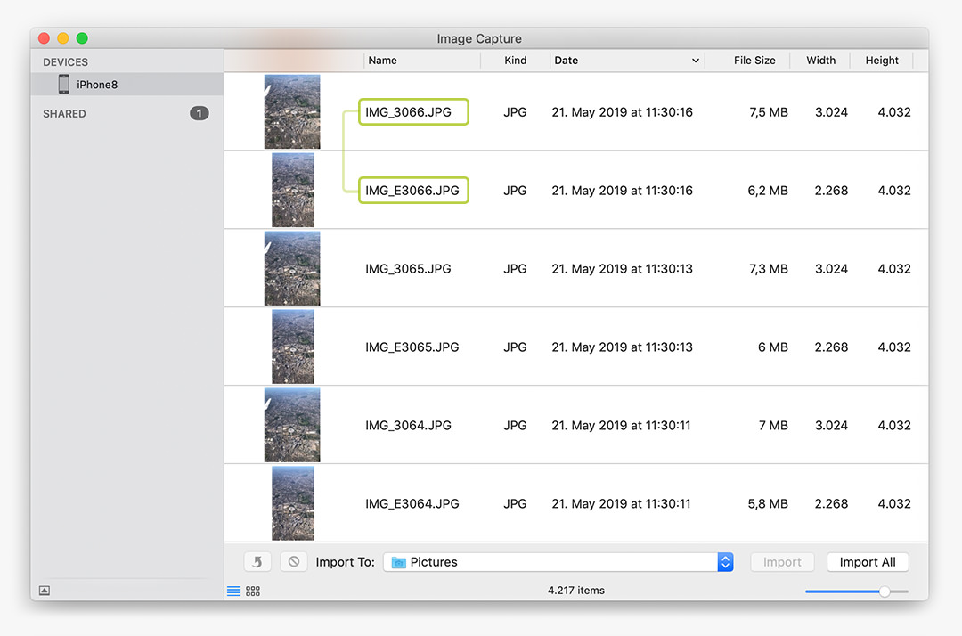 This practical app is preinstalled on macOS and it allows you to transfer files manually to your Mac. The original and the edited version will be listed and transferred as two separate files – but they still share the same file number (e.g. IMG_3066 and IMG_E3066 for the edited version).
