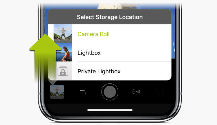 Organize your captures with our handy Album Selector. Swipe up from the preview thumbnail on the Capture Screen to select where you want to save new photos and videos: Camera Roll, Lightbox, or Private Lightbox.