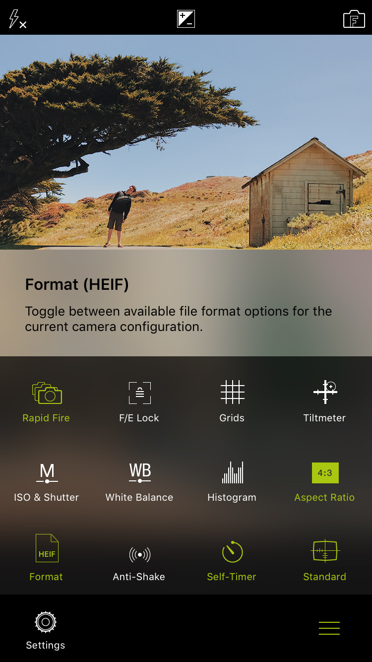 Via Settings > File format, you can also choose your preferred quality level (compression), which is a determining factor for the final file size. For HEIF files, a quality setting of 100% indicates a lossless compression. The HEVC compression for HEIF files is a lot more efficient than JPEG compression and creates less artifacts. This means even lower quality settings will create files of decent quality at very small file sizes.
