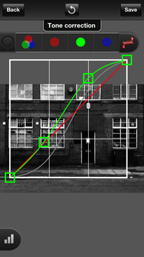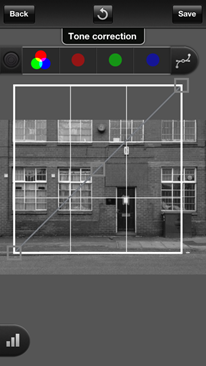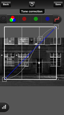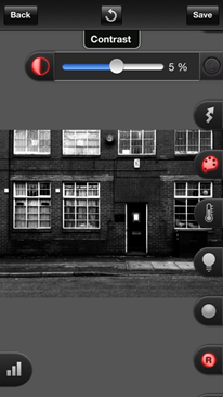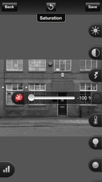 | First, go into the ProCamera Albums and Studios (right to left QuickFlick or under the PRO button) and open the photo in Pro Lab to transform it into a gritty black and white. | Open the saturation slider and drop it down to 0, making the photo grayscale. | Next launch the curves tool (top left).