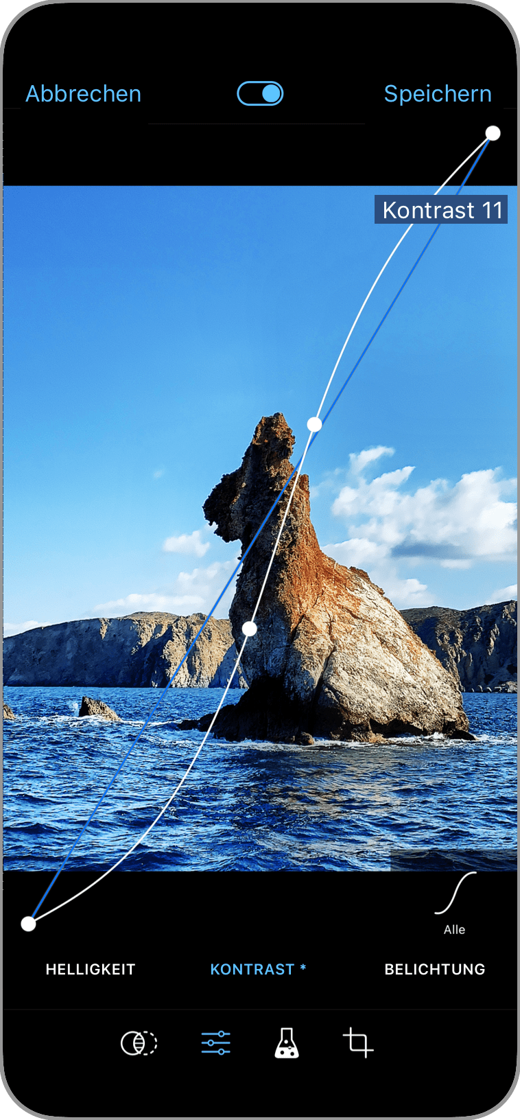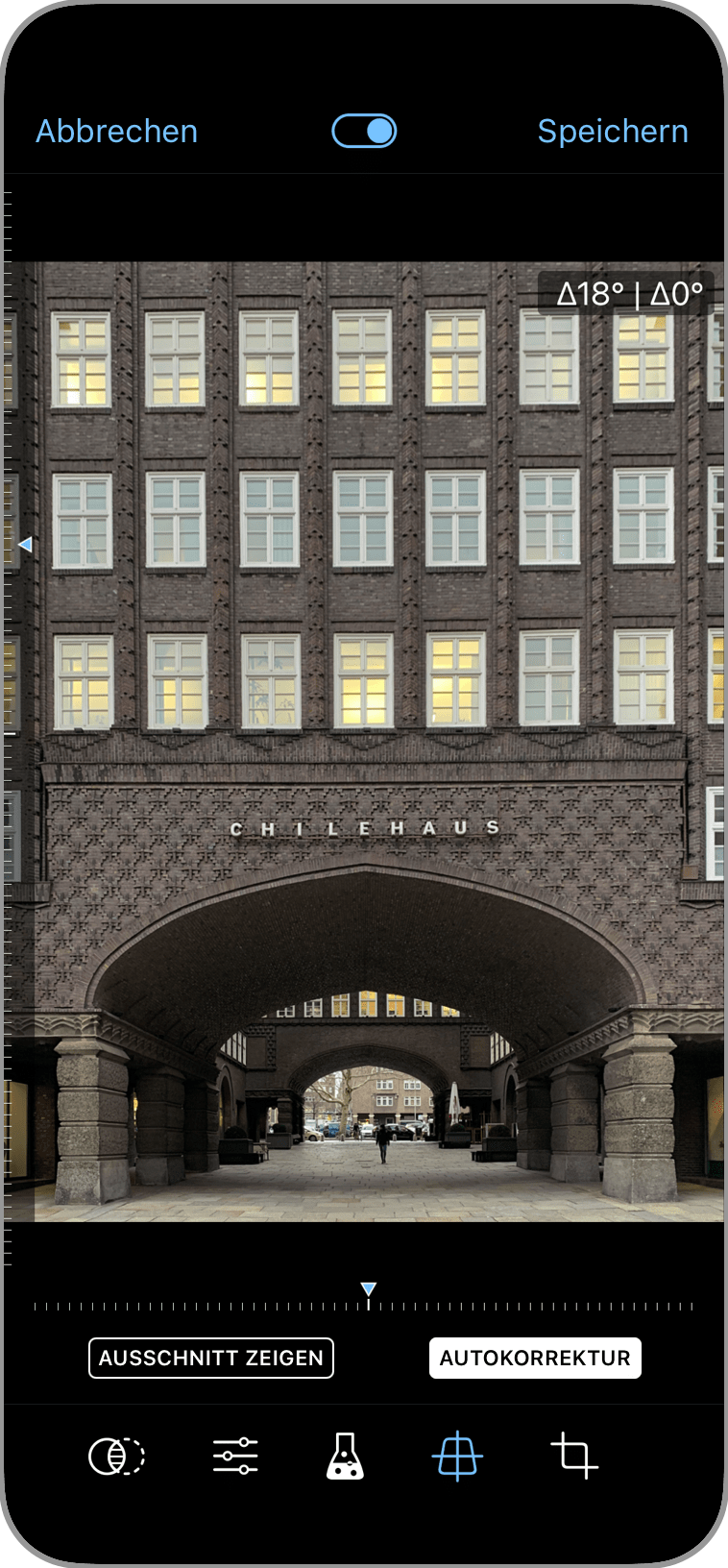 Durch die Korrektur stürzender Linien verleihen Sie Ihren Bildern eine professionellere Wirkung. Tippen Sie auf Autokorrektur für eine automatische Perspektivkorrektur oder Wischen Sie über das Bild, um manuell die Perspektive zu verändern.