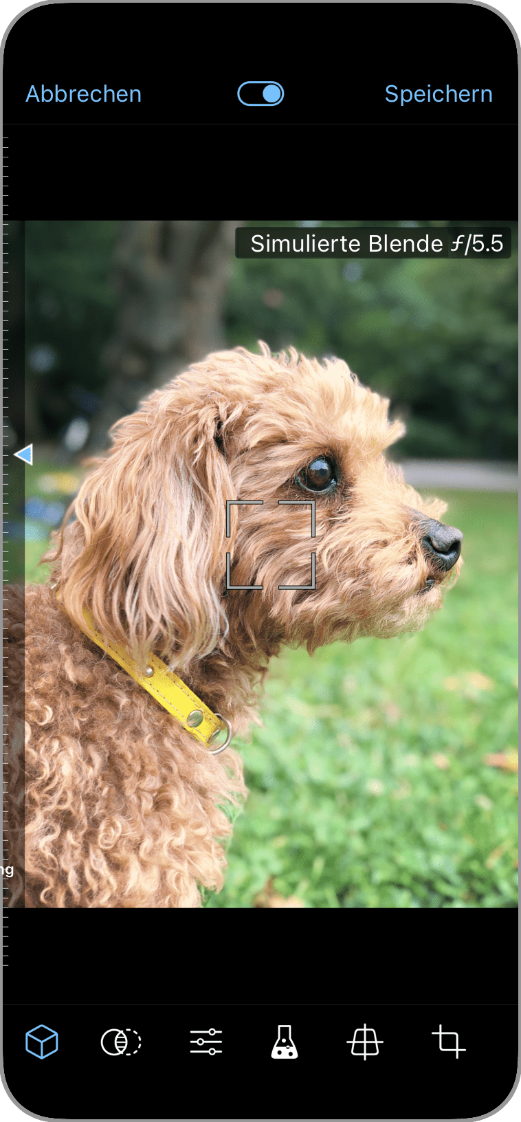 Simulierte Blende: Wischen Sie bei Porträt-Modus-Aufnahmen nach oben/unten, um die Intensität der Unschärfe im Bildhintergrund (Bokeh) nachträglich individuelle einzustellen. Tippen Sie auf eine bestimmte Stelle, um dort den Fokus zu setzen.
